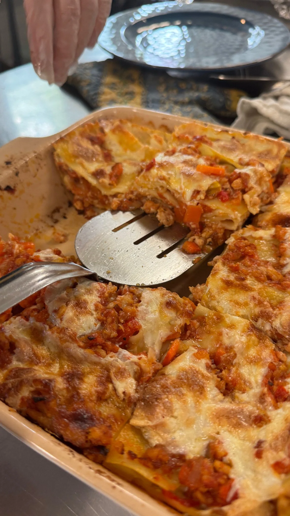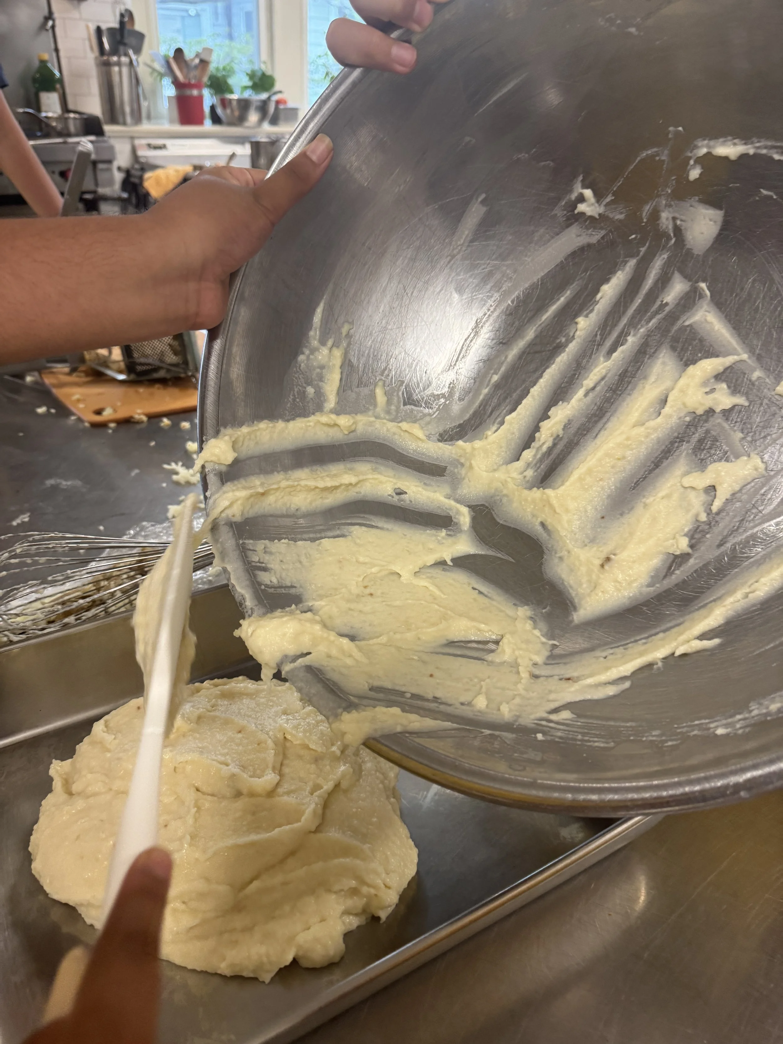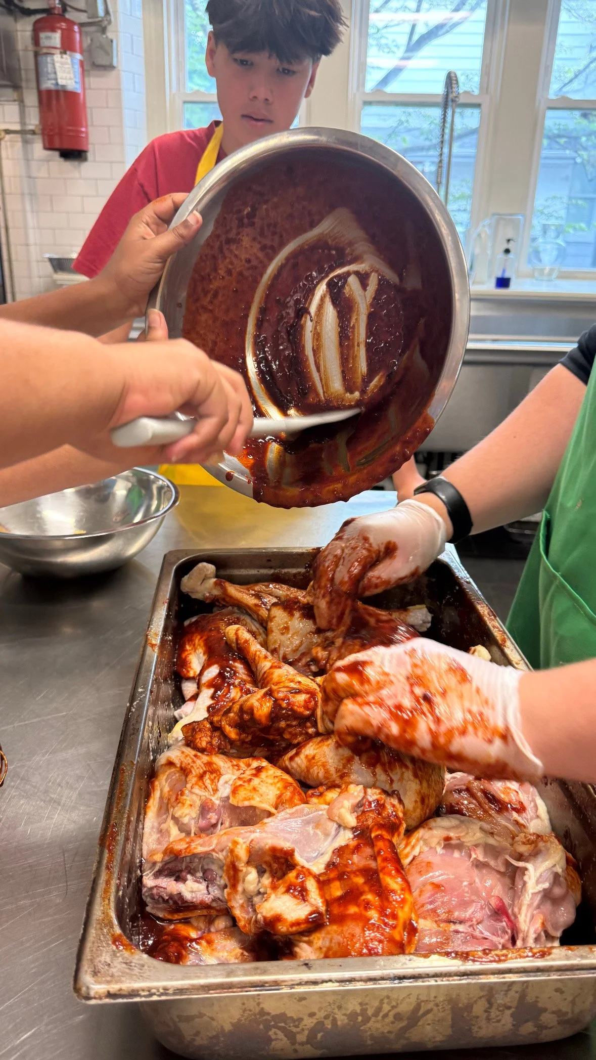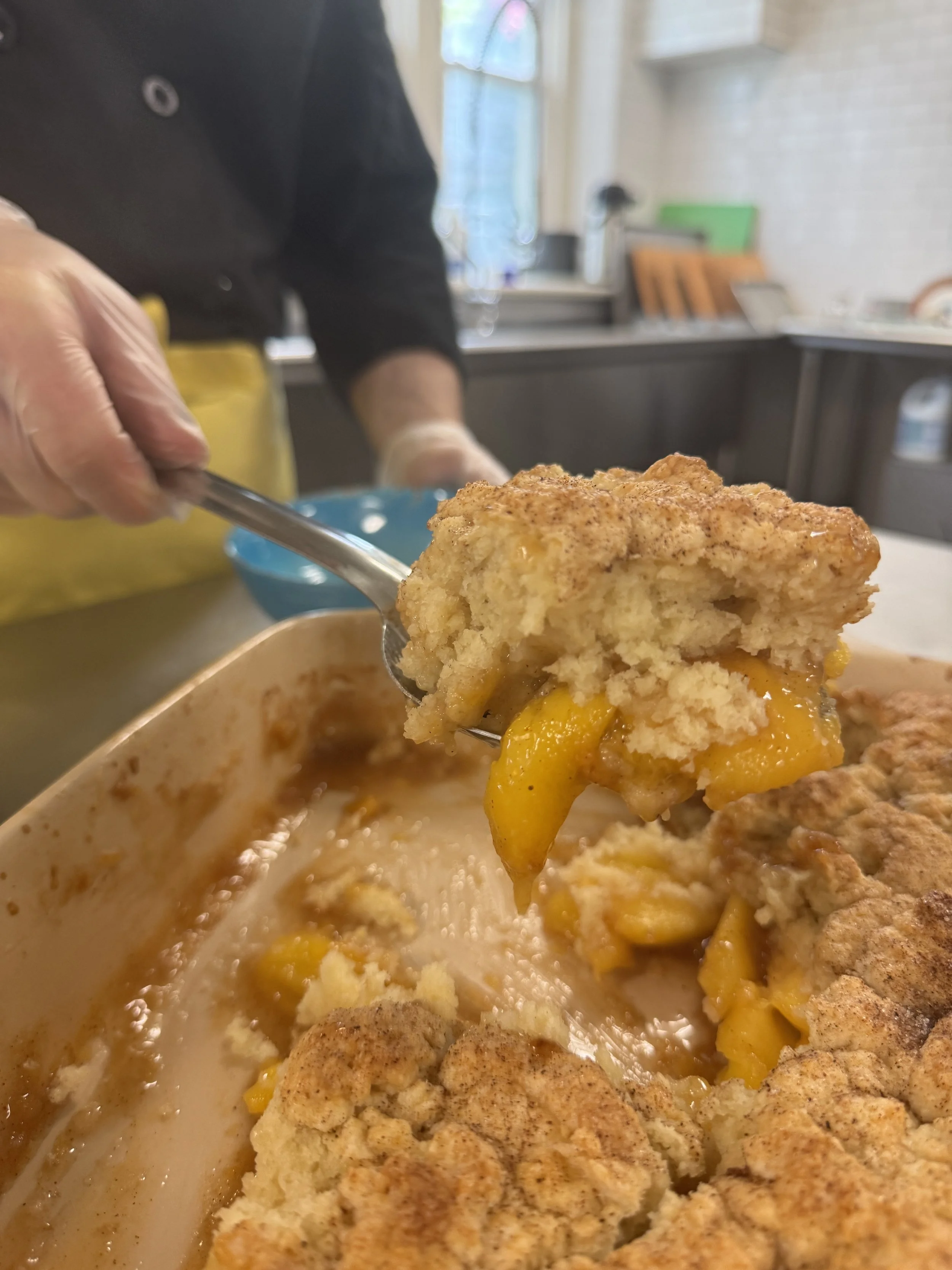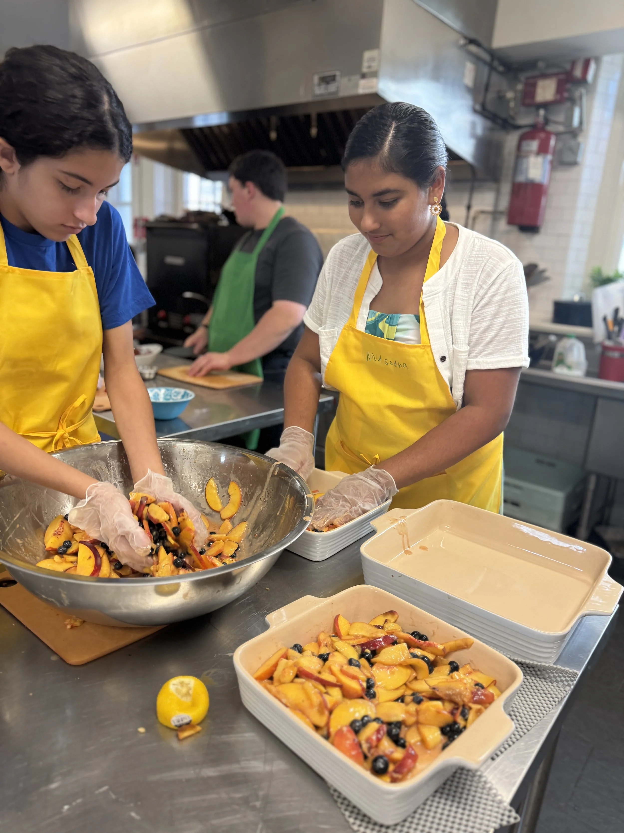 For the fourth day, the students made two main courses and a delicious dessert. They made Korean-style roasted chicken. They prepared a marinade with gochujang, gochugaru, and other seasonings. They also made baked lasagna with turkey, which could easily be substituted for mushrooms for a vegetarian option. For dessert, the students made a peach and blueberry cobbler to accompany the main dishes.