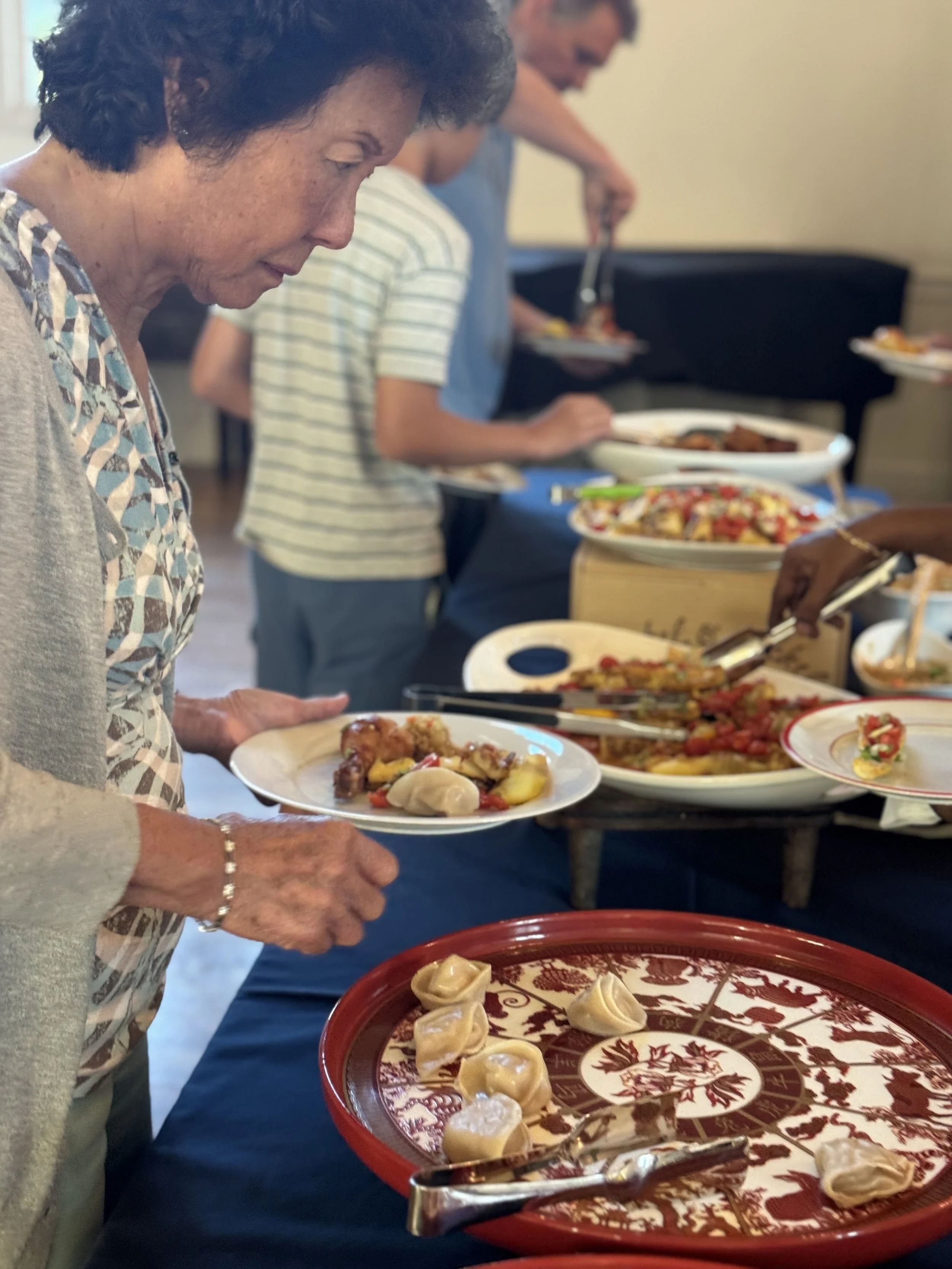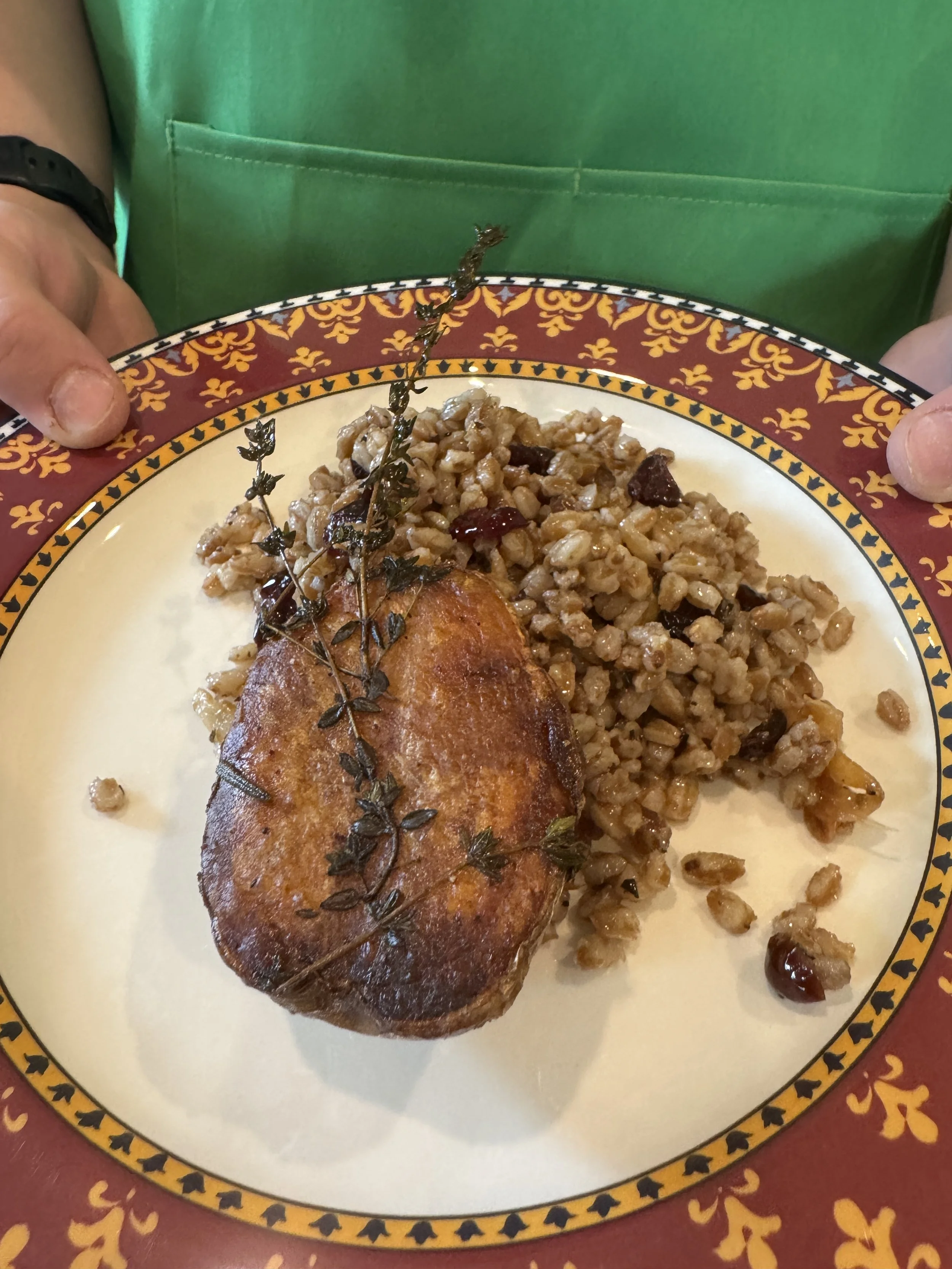 On the second day, the students focused on starters and salads. They began with savory chicken and vegetable gyoza, learning how to prepare the flavorful filling by combining minced chicken, finely chopped vegetables, soy sauce, and ginger. Another appetizer on the menu was smashed Yukon gold potatoes, lightly seasoned with salt and pepper. To complement the potatoes, the students prepared a rosemary orange barley salad. They whisked together vinegar, parsley, mustard, and other ingredients to create a tangy dressing, then tossed it with a mix of barley and wheat berries to finish off this salad.